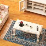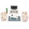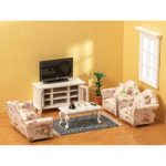 INCLUDES 16 ACCESSORIES: 1 couch, 2 arm chairs, 4 pillows, 1 TV cabinet (door can be opened), 1 television, 1 TV remote control, 1 coffee table, 1 area rug, 1 artificial plant with pot, 2 cups of coffee, 1 coffee pot. All of miniture house furniture doesn’t need assembled.