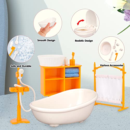 Dollhouse Bathroom Set:Simulated doll house bathroom included toilet, bathtub, mirror, wash basin, storage cabinet, shower curtain, shower stand, toilet brush, toothbrush, shower gel, towel etc.Fully bathroom furniture can inspire kid’s creativity & imagination to enjoy and have fun.