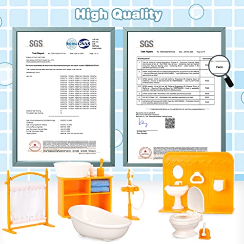 Real Bathroom Scene:Dollhouse furniture with simulated bathroom accessories encourage kids to role-play with partners or friends.The toilet lid is available to be opened and closed as real and the bathtub can be filled with water.Bring endless fun for children!